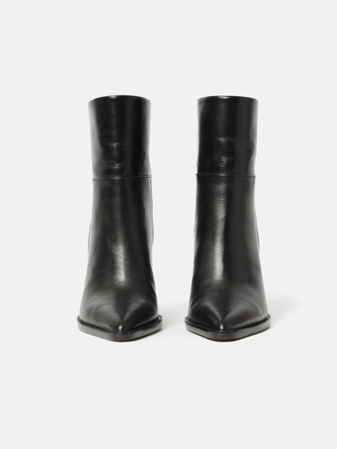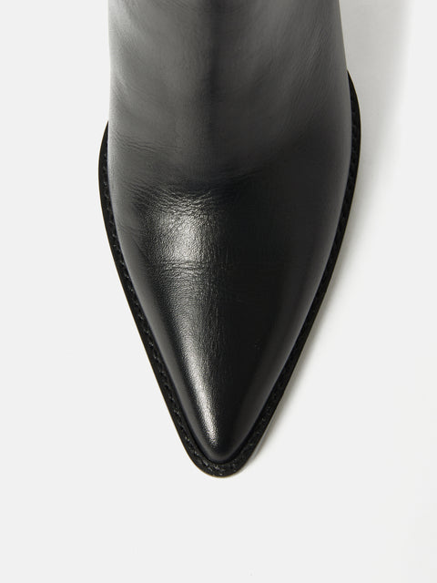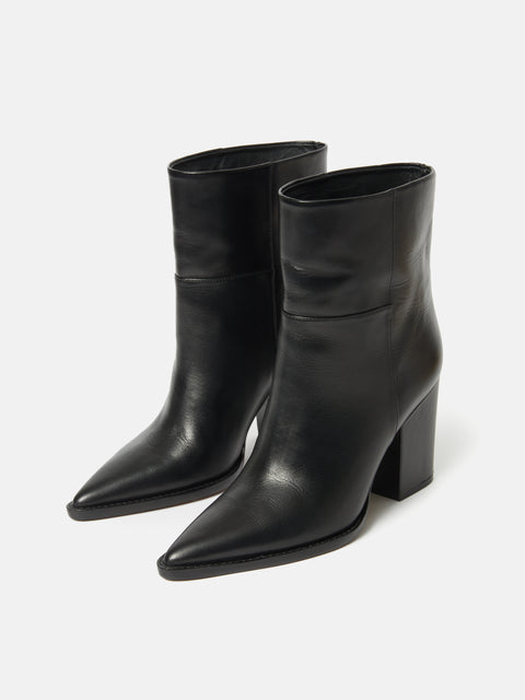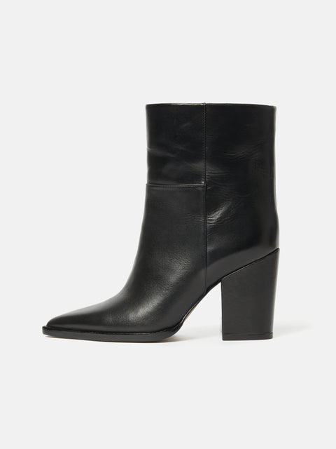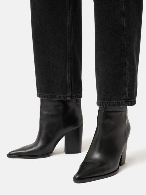 Made of smooth, sleek, leather our Connaught Heeled Boot features a pointed toe, straight leg and chunky block heel for a modern take on the classic black ankle boot. Find comfort in the underfoot padding in this wear all day shoe and pair with wide leg trousers or denim with a crisp white shirt for a perennial look. Fit and Features