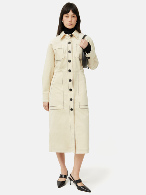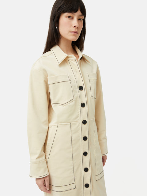 Indulge in versatility with our dual-purpose garment featuring an elasticated back waistband, soft cord construction, and horn button-through front. Seamlessly transitioning between a dress and a coat, this two-in-one ensemble invites you to curate your style with effortless sophistication. Top-stitching details are meticulously placed to complement the allure of winter white cream, ensuring a refined and chic aesthetic for every occasion. Fit and Features
