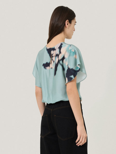 Our in-house print designer took inspiration from the faded grandeur of manor houses and peeling wallpapers revealing hidden patterns underneath when it came to creating our Floral Drift print. This drape sleeve top showcases the unique pattern through a print placement technique. We married this with a fluid silk blend to complement the soft, distorted tones of the florals.