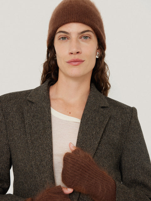 The finishing of our Halo cashmere is so specialised, only two factories in the far east will work with it. This is why we've kept the full traceable fabric to a limited run across this season's knitwear and accessories for a truly unique piece in your wardrobe. This cashmere beanie is ready to top off all your cold weather looks with a soft, fuzzy finish.