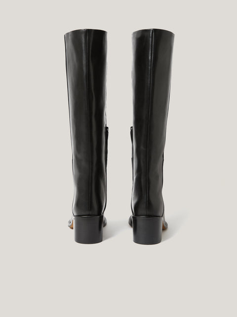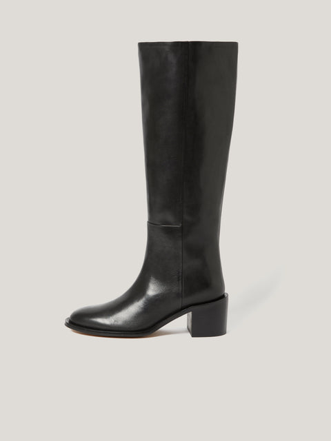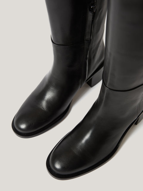 The classic riding boot reaches new heights with this chunky block heel design. Crafted from super-soft calf leather with a side zip fastening and a sleek almond toe, wear for an equestrian-inspired finish to any day or night look.