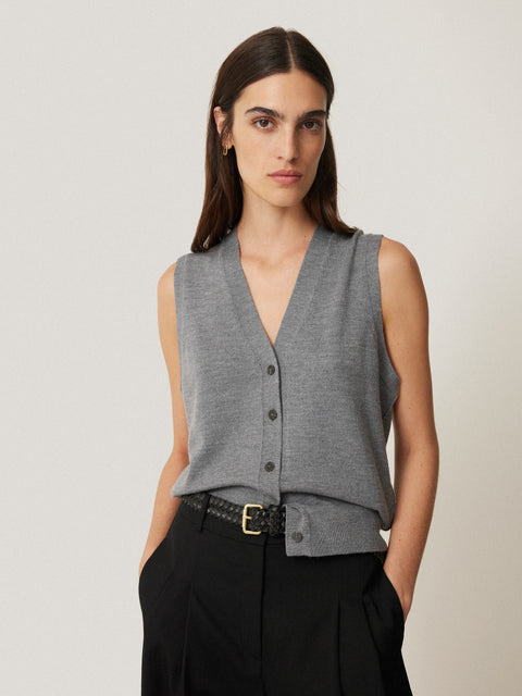 Beautiful merino wool provides lightweight warmth as seen with this timeless waistcoat design. Finished with a button down front, we love that this piece can be worn alone with a simple necklace or layered over a basic T-shirt on cooler days with a pair of knee high boots.
