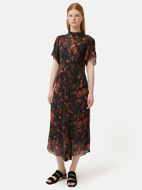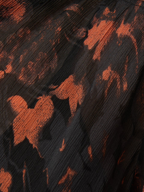 Embrace the allure of the most captivating colour palette in rust and black, effortlessly setting the stage for your individuality. Crafted from crinkle sheer fabric, this dress boasts a sophisticated silhouette with pintucking at the waist, drape sleeves, and a slight cowl neck, ensuring you make a bold statement while exuding an undeniable sense of grace.