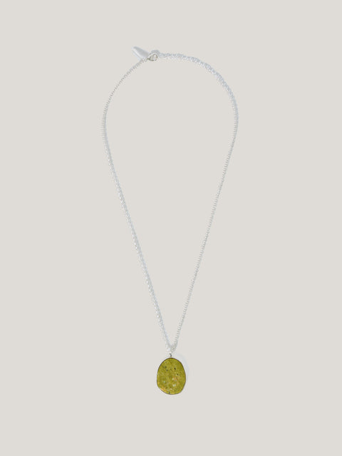 A slice of green jasper brings opulence to this statement pendant necklace. A healing talisman known for its grounding and stabilising properties makes this piece perfect for those who seek inner calm, as well as being loved for its vibrant green tones. Due to the natural properties of the stone, each piece will differ in appearance and colour.