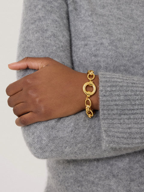 Opt for chunky gold chains to lend a vintage-inspired touch to your jewellery accessorising. This Round Link Chain bracelet in 24ct gold plating features a slender oval chain interspersed with textural double hoops and a central round hoop pendant.
