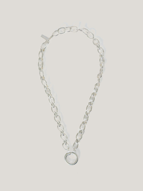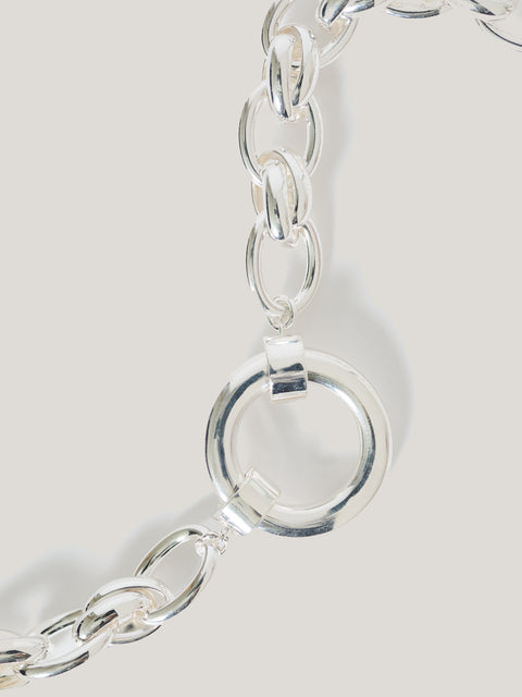 Opt for chunky chains to lend a vintage-inspired touch to your jewellery accessorising. This Round Link Chain necklace in silver plating features a slender oval chain interspersed with textural double hoops and a central round hoop pendant which you can use to attach charms.