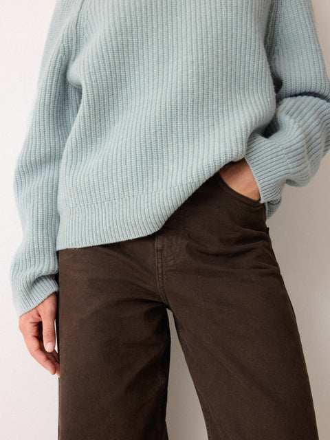 Reimagined in a cosy oversized cocoon shape, this forever knit is woven from responsibly sourced merino wool. The rib, sometimes called half cardigan stitch, was traditionally used on men's fishing jumpers which we have reworked for a modern twist using external seams on the raglan armholes and collar. Inga is 5'11 and wears a size 8