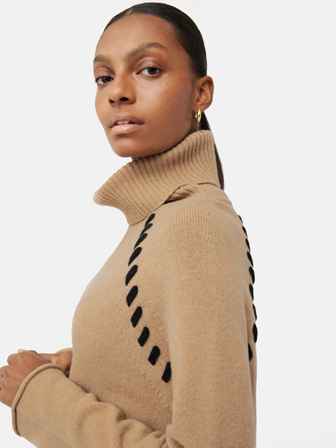 Supersoft merino relaxed jumper featuring beautiful handcrafted overstitch detail at the raglan seams. Designed with a loose fit and long scooped hem to cover the hips. The slouchy deep neck can be pulled up around your chin to keep out the cold. Fit and Features