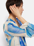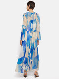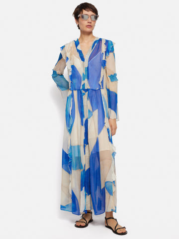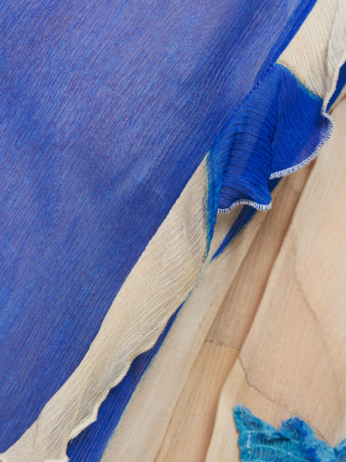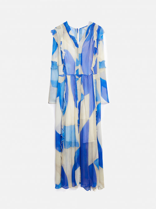 A feminine silhouette; boasts a hand-painted motif that draws inspiration from the Tachisme art movement, then recoloured into the Moroccon blue of Jardin Majorelle. Detailed with viscose crinkle georgette bases, fluted sleeves, whilst raw edge frills and ruching adds a romantic twist to occasion styling.