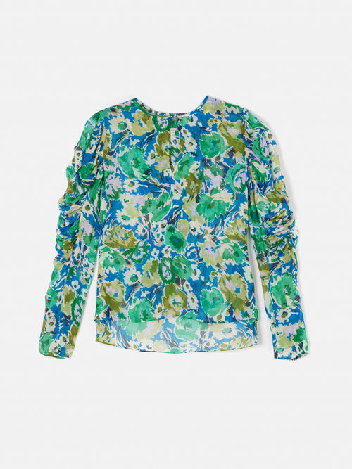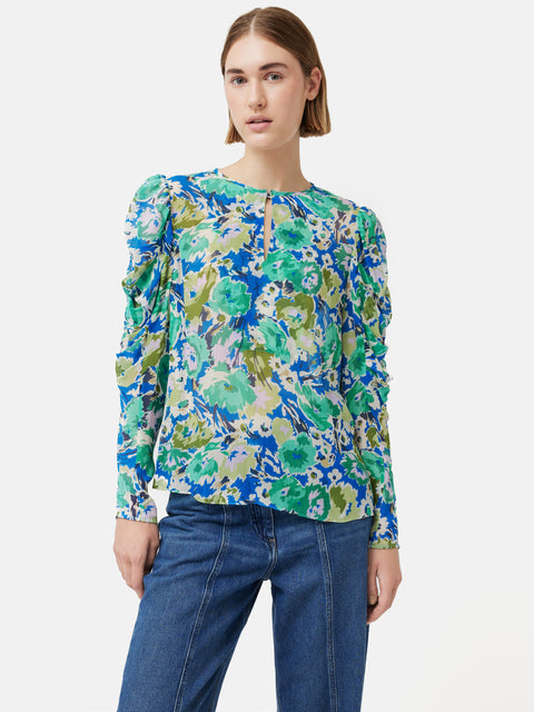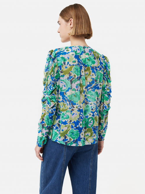 Voluminous long sleeved ruched detailing top. Our Abstract Meadow printed top is perfect paired with tailoring, butter soft leather or denim separates. Textured viscose crinkle, this easy fitting shape has a button fastening allowing you to wear as a v neck also. Fit and Features