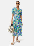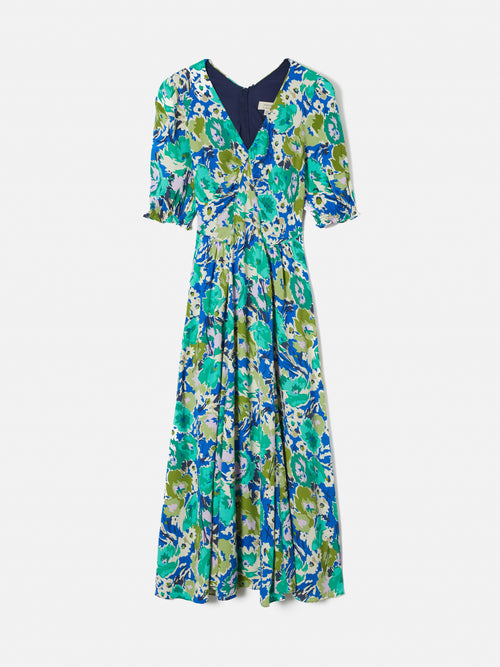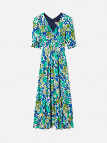 The best-selling dress silhouette returns in a new colourway of our Abstract Meadow print. Features a clean v neckline, short sleeves ruched at the cuff and a full skirt. A fitted, flattering shape with an invisible back zip and lined bodice. Style through the seasons, with sandals now and boots later. Fit and Features