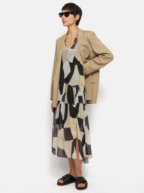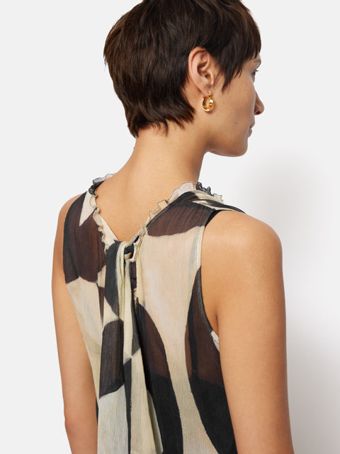A sleeveless midi dress to transition you from day to evening. This feminine black and cream silhouette has an asymmetric hem and softly frilled neckline. Artfully hand-painted with acrylic paint, watercolours, pastels and pencils, as its focal point the abstract print draws inspiration from the Tachisme art movement.