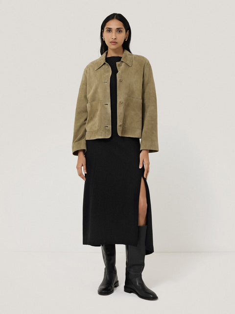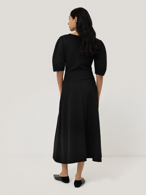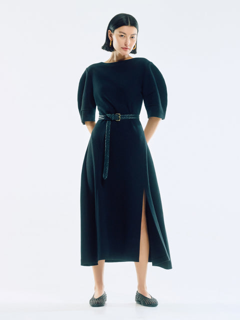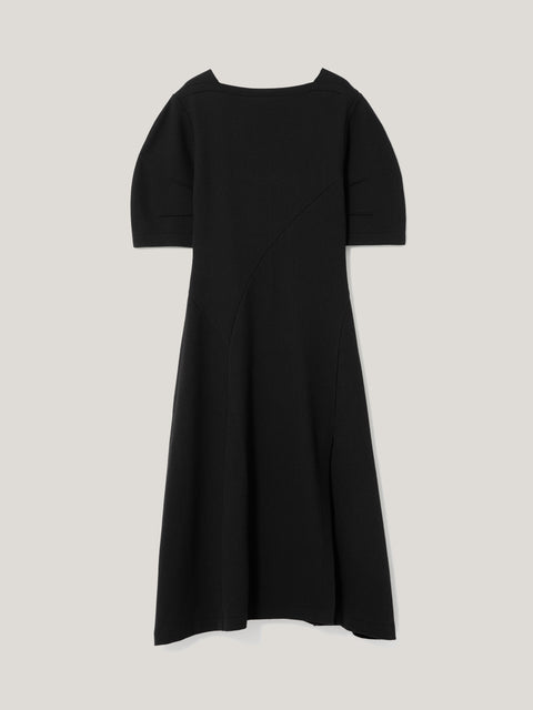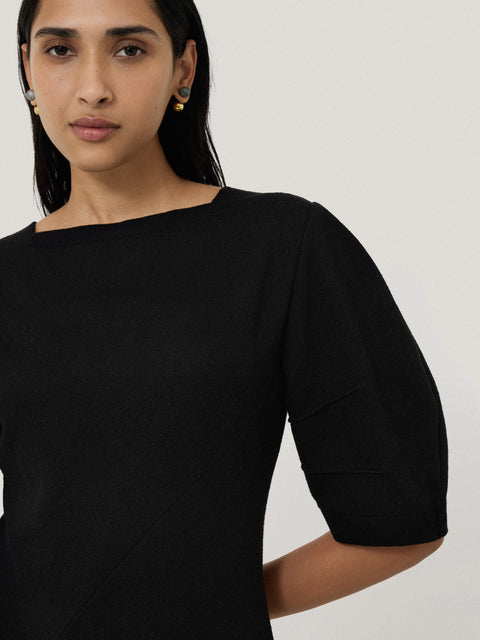 Our beautiful textured jersey is reimagined into a dramatic day or night dress with this piece. A high curve neckline is met with short, cocoon sleeves and asymmetric, angled seams at the body and skirt for a contemporary take on contoured lines.