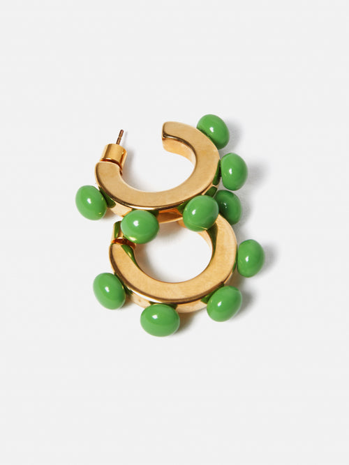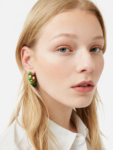 Our colourful statement earrings crafted in Italy using resin mounted on luxe coated metal hoops updated in a fresh green colour resin. Fit and Features