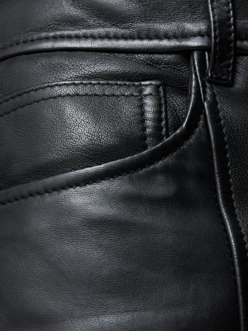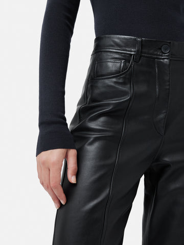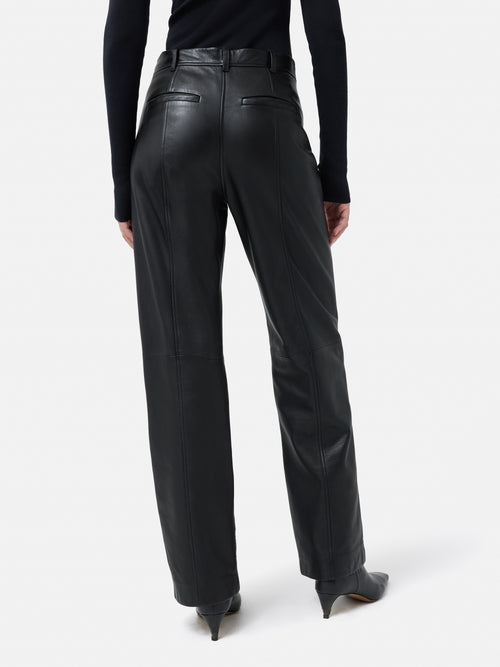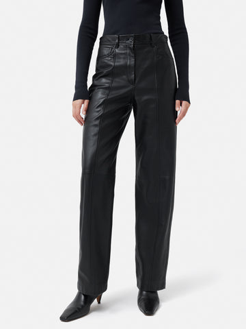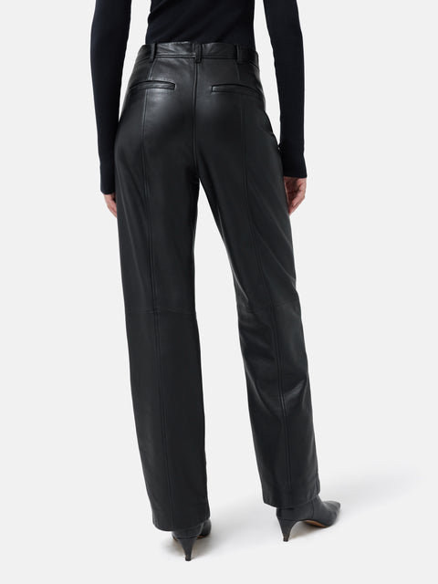 If you love our tailored beck jeans then this trouser is for you, Cut in butter soft leather. This trouser has front and back stitch detail and easy wide leg shape to elevate your sweater and sneaker, laid back style. Fit and Features