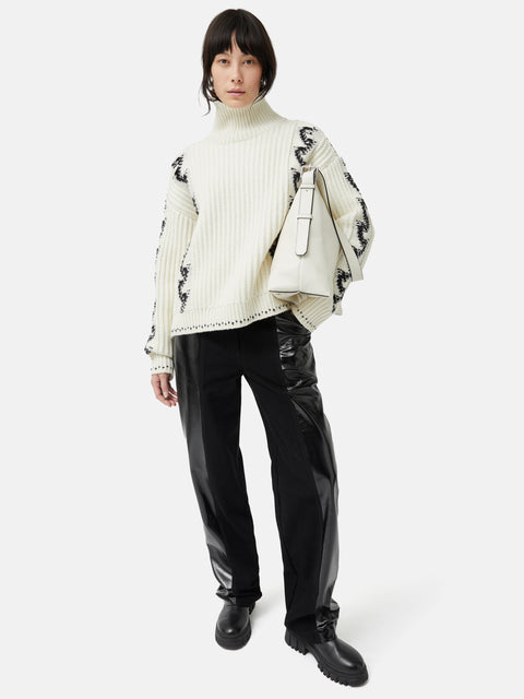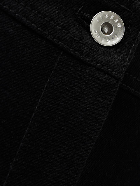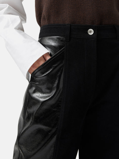 A delightful twist to our beloved Beck jean silhouette: now adorned with a striking contrast panel in Japanese patent crinkle fabric. The tailored regular rise, combined with a straight loose leg and sleek vertical seams on both front and back, crafts an incredibly flattering silhouette. Fit and Features
