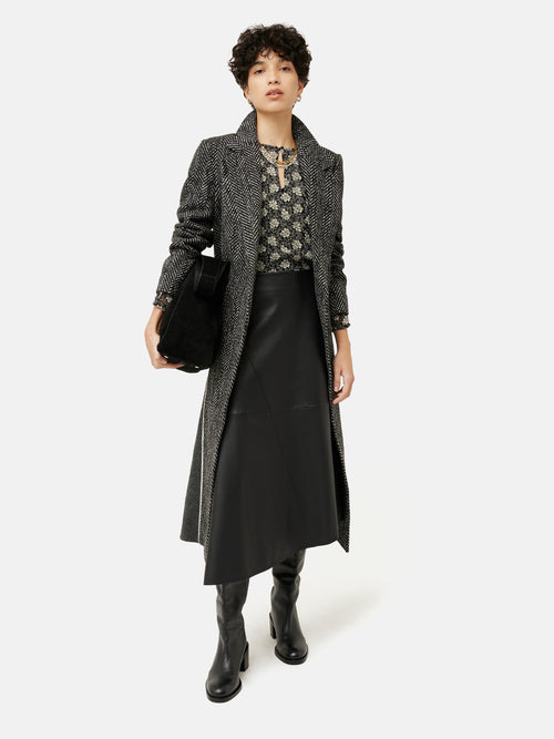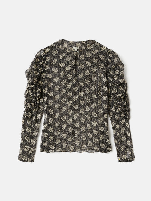 Voluminous long sleeved ruched detailing top. Our Block Leaf printed top is perfect paired with tailoring, butter soft leather or denim separates. Textured viscose crinkle, this easy fitting shape has a button fastening allowing you to wear as a v neck also. Fit and Features