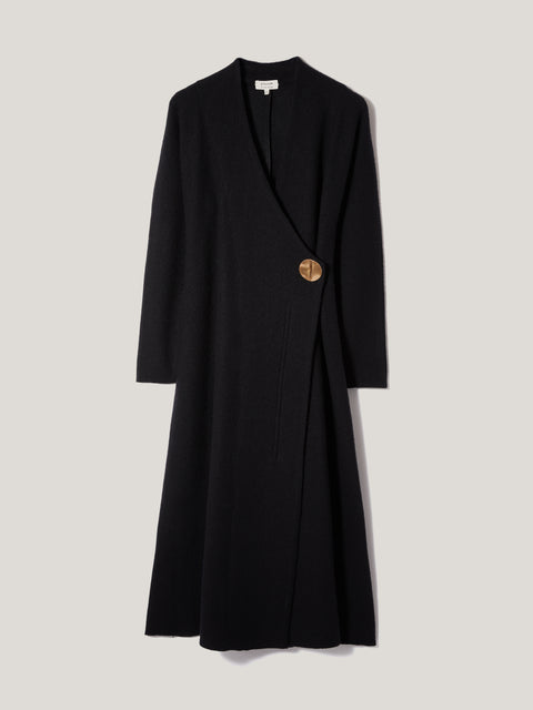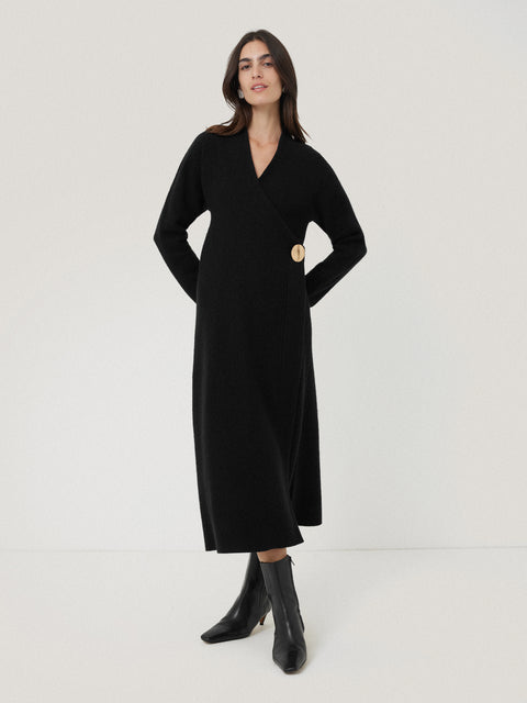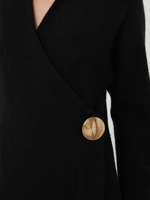 A statement molten gold disc fastening designed especially for Jigsaw makes this dress completely bespoke to us and your wardrobe. Boiled wool is used to bring structure to this piece, fitted with clever details including an internal zip detail at the front to keep it closed, while a popper stud keeps the wrap in place. Batwing sleeves and a fitted waist exudes subtle femininity for day or night. Wear with flats now and style with boots for later when the weather cools.