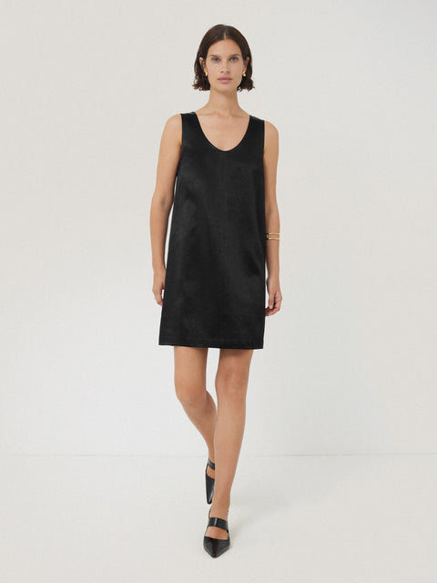 A minimalist's take on the little black dress, we love the Bonded Satin mini for its mid-weight finish and lustruous sheen; ideal for evening or daytime layering over a long sleeve top or blouse. Cut for a chic A-line fit with a simple scoop neckline, this pinafore style will slot effortlessly into any wardrobe.