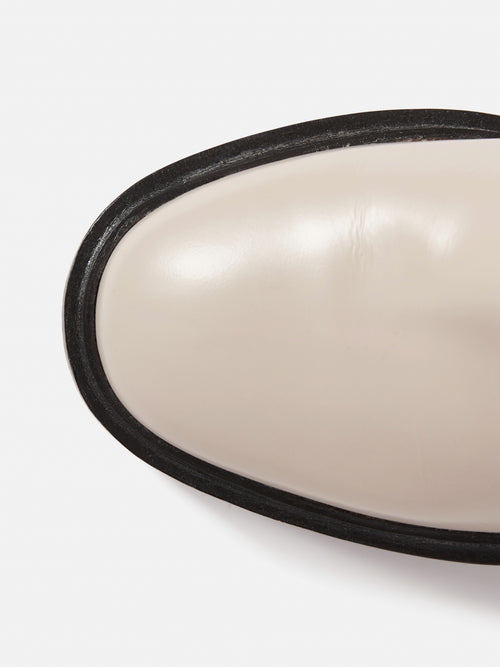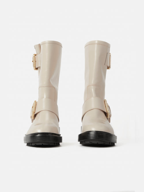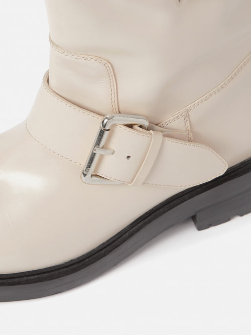 Crafted in glossy box leather, detailed with silver buckles and gripped rubber soles for extra traction, our Biker Boots will become a perennial icon in your wardrobe. With two options, a fresh off white or rich khaki green, wear through fall worn with bare legs and dresses and into winter with chunky knits. Fit and Features