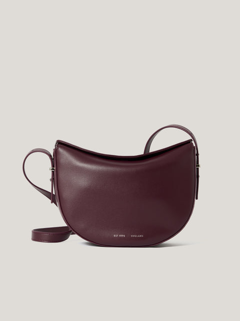 Our Sling Fold Over Bag in a deep cherry red is a perfect bag for day to night in a smooth and supple leather finish. With a magnetic closure, adjustable strap and contrasting silver metallic trims.