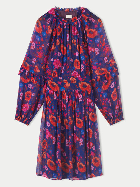 A new shape in our best-selling Celestial Floral print, re-imagined in more Autumnal hues. Textured viscose crinkle is used to create this feminine dress, shorter in length with pleated detail voluminious sleeves and pretty ruffle details. V neckline with a button fastening, flattering waist panel with a full skirt and elasticated cuffs. for a more relaxed fit on the waist, please size up one size from your normal. Fit and Features