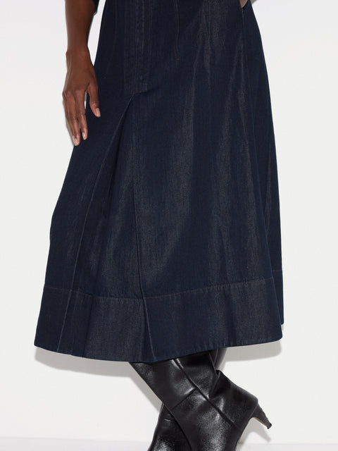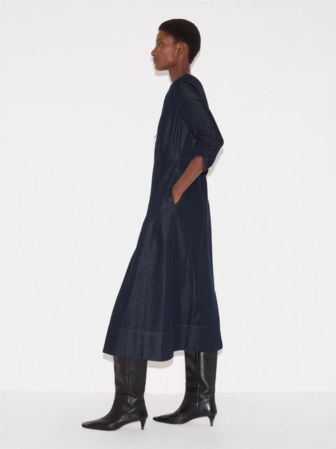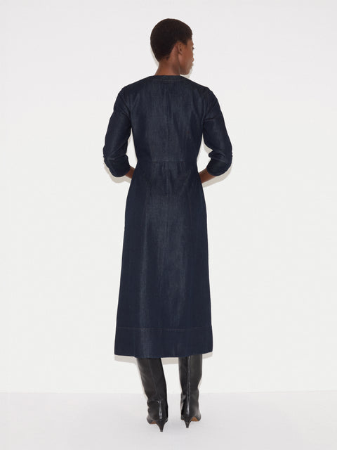 Light chambray and a full-length zip give this midi dress an easy, modern feel. Ideal for year-round wear, combine with low-heeled leather boots and a suede tote for an easy weekday look. Mame is 5'9.5 and wears a size 8