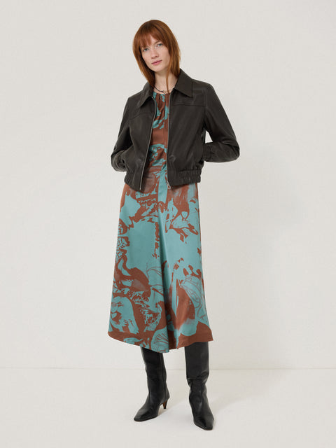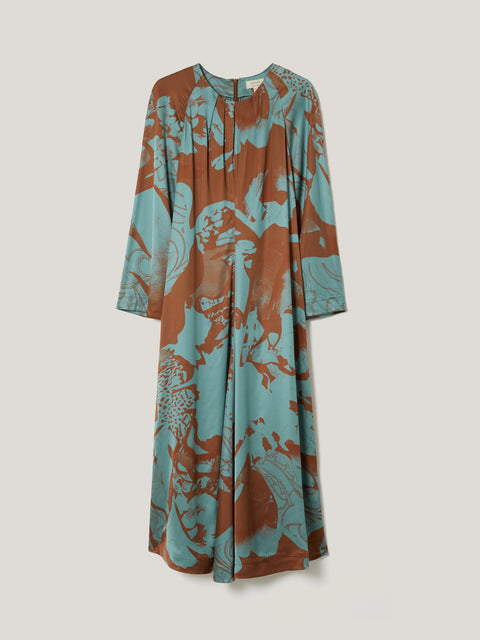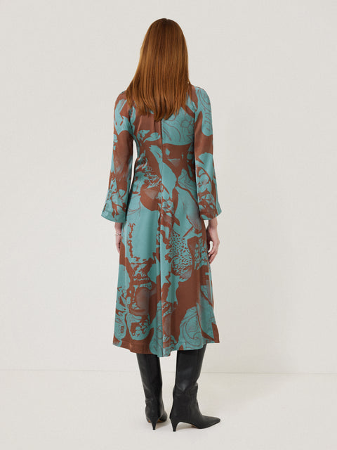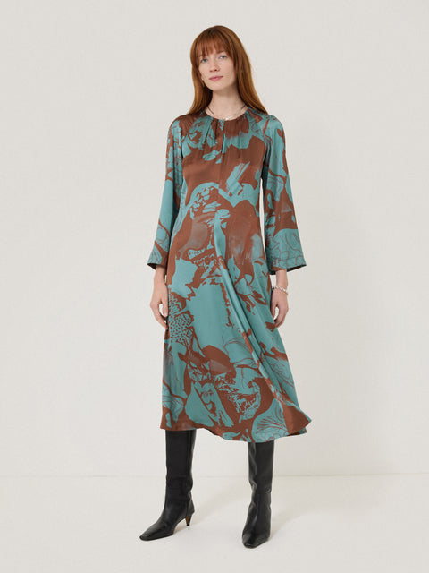 The Collage Floral print was developed by our in-house print designer. Inspired by the faded grandeur of manor houses and peeling wallpaper, this print started out as a collage before flourishing into its digitised pattern of teal and blue tones. Elements of the print recess into the background bringing depth to each piece. Crafted from viscose, this long sleeve dress has a central seam down the front with gentle gathering around the neckline, flared sleeves and a flowing maxi silhouette adding to its romance.