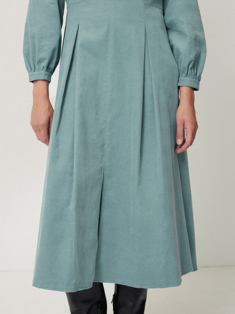 Corduroy shows its cooler side in an icy blue hue for the new season with this midi dress. The open collar design features dart detail to subtly draw in the waist, with a front slit and refined proportions on the cuffs, ultimately bringing femininity to a classic dress silhouette.