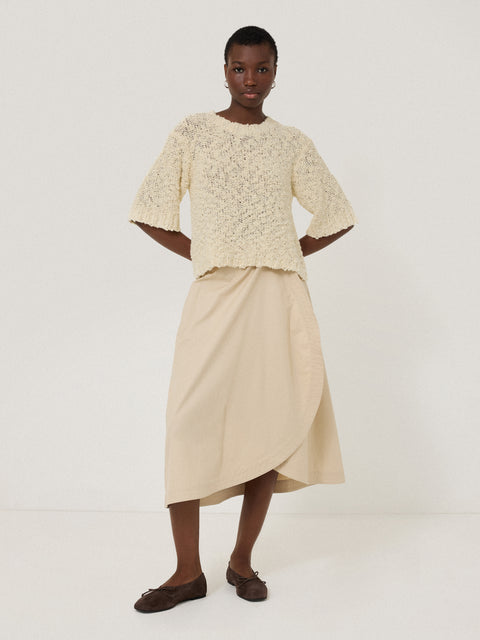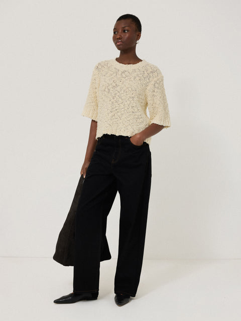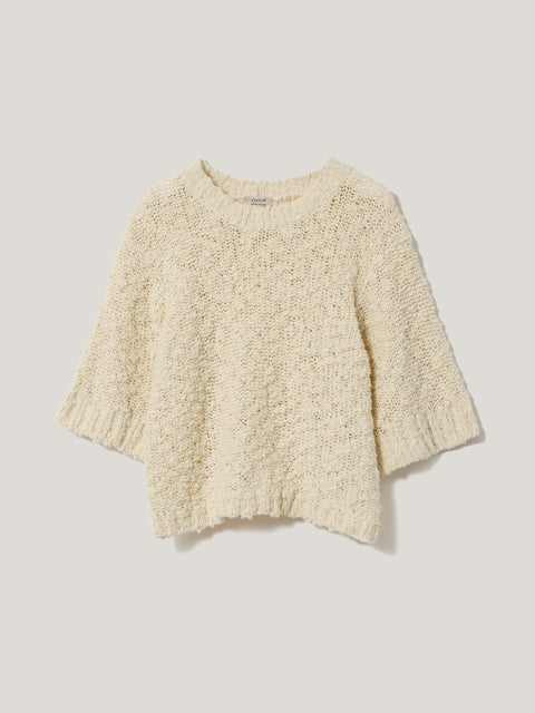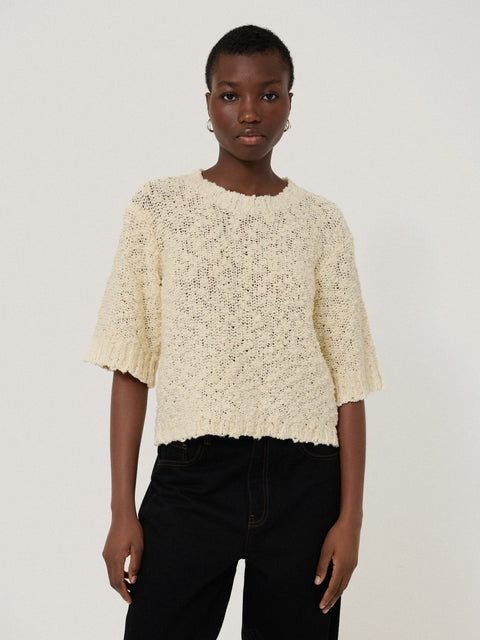 A T-shirt with tactility, this top is elevated in a cotton blend boucle knit. Cut for a relaxed fit with elbow length sleeves, wear with wide leg denim for a laidback weekend look.