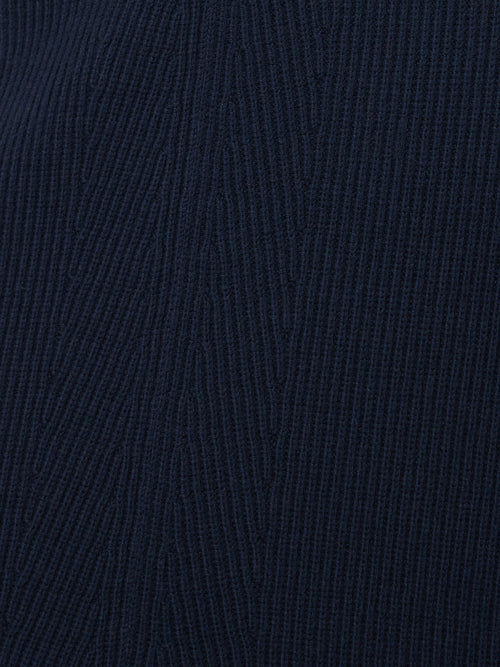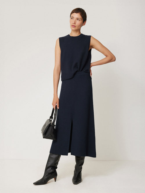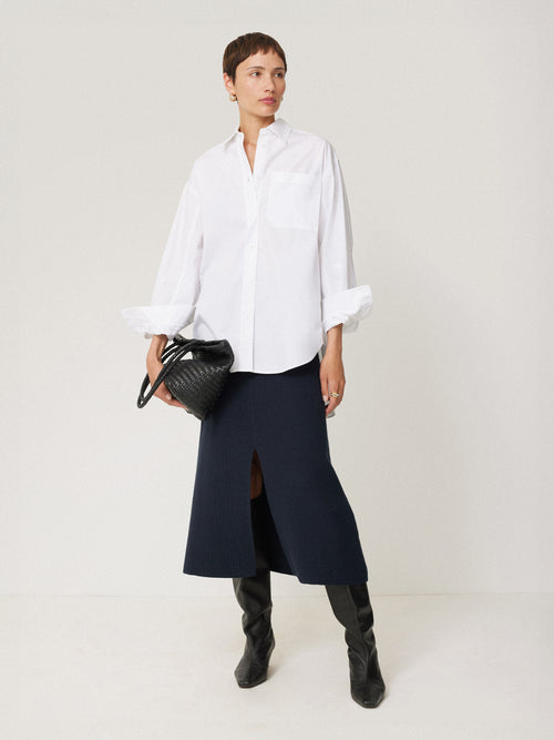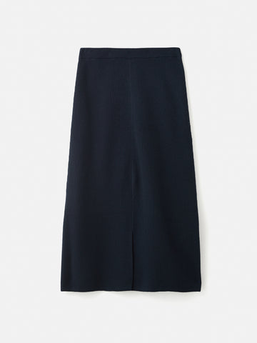A body-skimming silhouette imagined in a sultry navy hue characterises the Cotton Blend Knitted Skirt, along with an elegant slit that can be worn at the front or back, depending on where the mood takes you. Made from a cotton blend mid-weight rib knit, the skirt can be pulled on with ease thanks to an elasticated waist that then sits flat and softly on the skin, allowing for perfect trans-seasonal comfort.