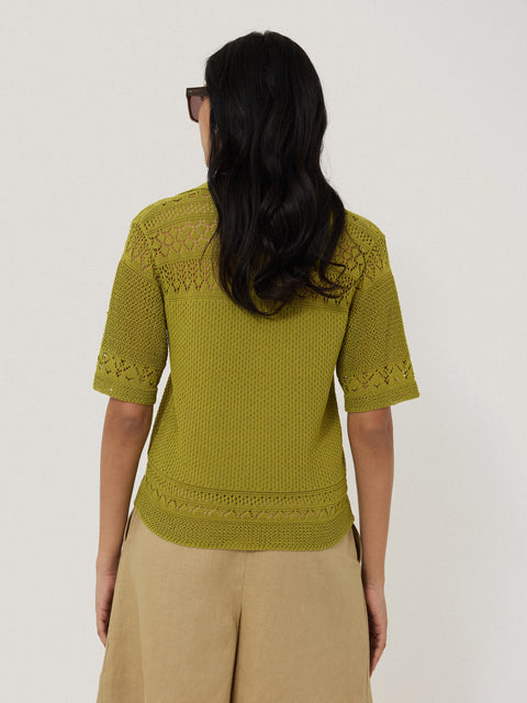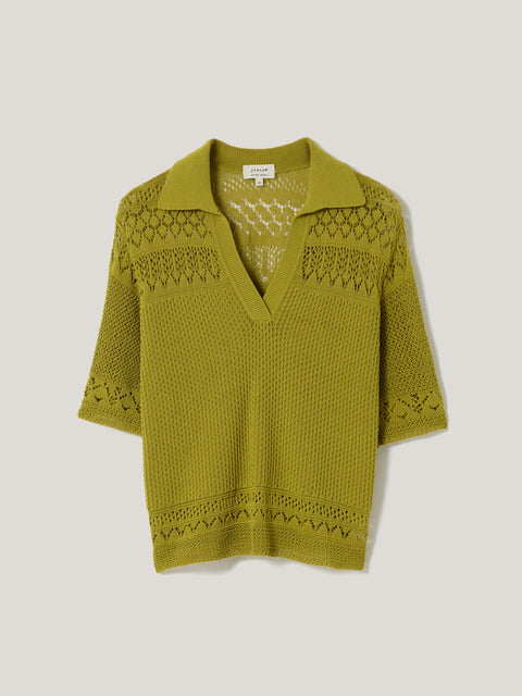 The preppy polo is given a holiday-ready twist with this open V-neck shirt, knitted from a cotton blend pointelle for an artisanal, crocheted look. Team with laidback linen shorts and silver jewellery.