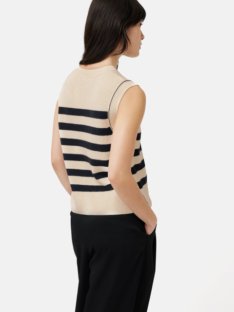 A new spin on a cherished classic, we've reinvented the ever-popular cotton blend tank in cutting-edge stripes. This tank becomes the essential piece for mastering the elegance of monochrome dressing. Pair it elegantly with a coordinating white shirt or inject a burst of colour by layering it over a vibrant top. Fit and Features