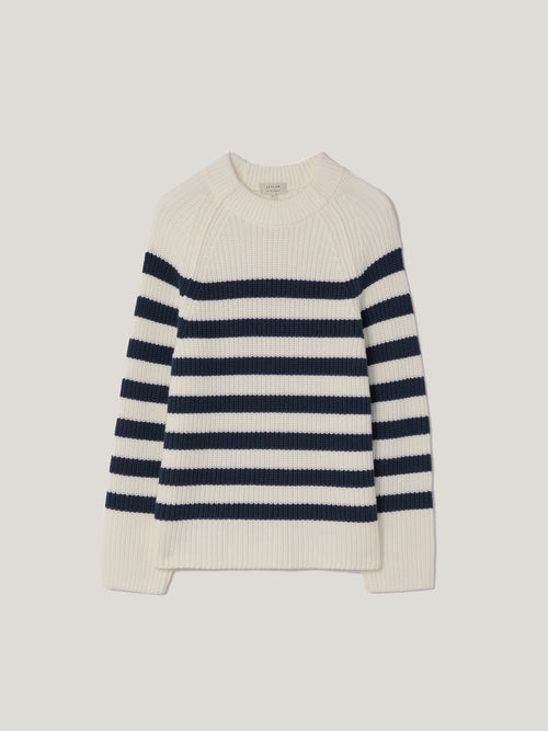 The Breton stripe top is heralded as a wardrobe classic. We've reimagined the Parisian design in an ecru and navy chunky cotton blend knit, perfect for keeping cosy yet sophisticated during the colder months.