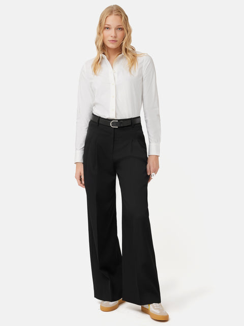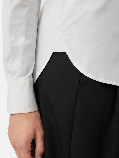 Nothing is more classic than a cotton white shirt. But its the crisp cotton poplin and classic Mother of Pearl buttons that distinguishes it from the rest. The tailored seams craft a silhouette that exudes sophistication, lending a refined charm that effortlessly complements both tailored blazers and cozy knitwear. Fit and Features