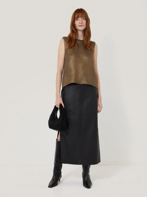 Our signature cotton knitted tank receives a metallic makeover with a foiled finish, bringing subtle shimmer into your casual attire too for party season. Finished with ribbed hems, we love layering on its own with wide leg trousers or to add interest to a crisp white shirt.