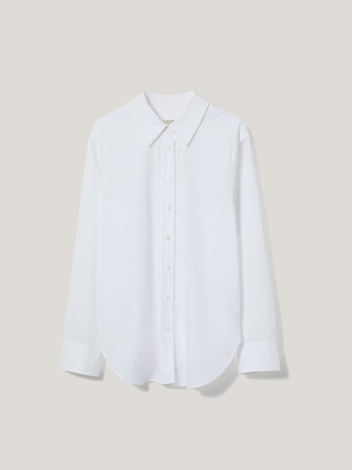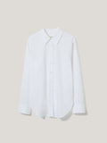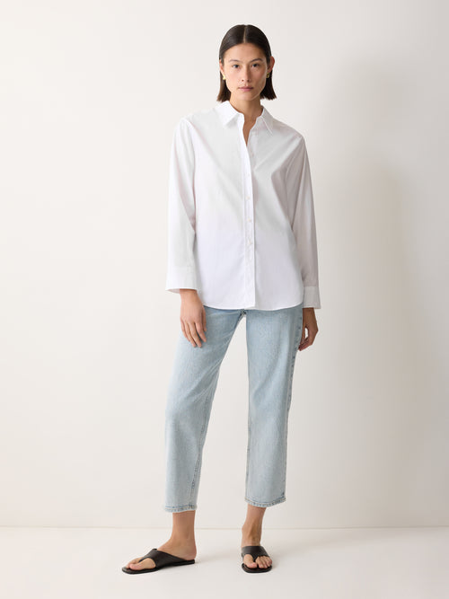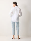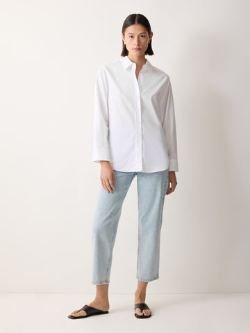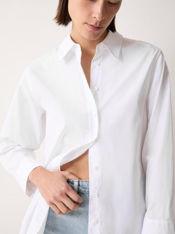 The classic white cotton poplin shirt reigns supreme in the wardrobe. This style is evocative of classic men's styling with side slits, a box pleat and scooped shape hem. Elevated by Mother of Pearl buttons and top stitch details, the oversized silhouette allows for multitude of looks, whether to wear tucked in or untucked with sleeves rolled up or down. Aksharra is 5'9.5 and wears a size 8