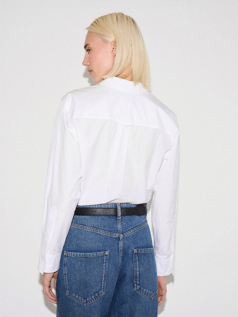 The classic white cotton poplin shirt reigns supreme in the wardrobe. This style is evocative of classic men's styling with side slits, a box pleat and scooped shape hem. Elevated by Mother of Pearl buttons and top stitch details, the oversized silhouette allows for multitude of looks, whether to wear tucked in or untucked with sleeves rolled up or down. Aden is 5'11 and wears a size 8