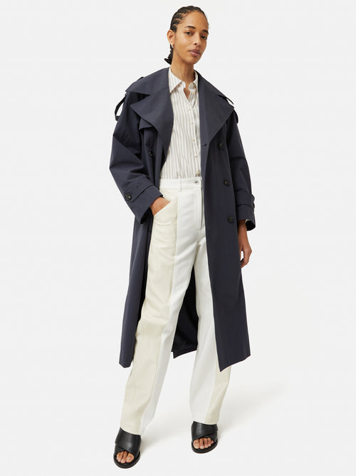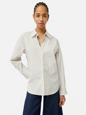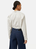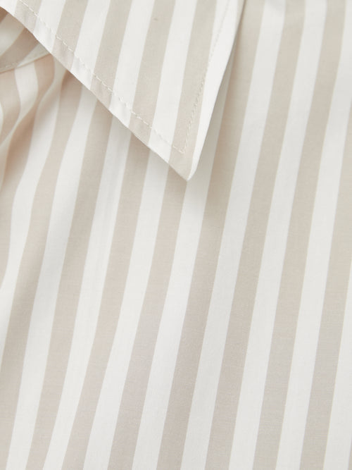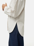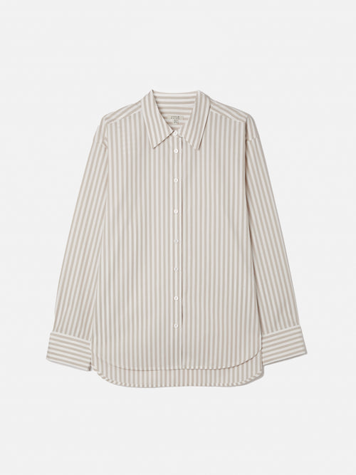 The classic striped soft cotton-poplin shirt is evocative of classic mens tailoring including side slits, a box pleat and scooped shape hem. Elevated by mother of pearl buttons and top stitch details. The oversized fit allows for an adaptable silhouette, can be worn tucked in or untucked with sleeves rolled up or down. Pair with denim seperates or new season tailoring for an autumnal reset. Fit and Features