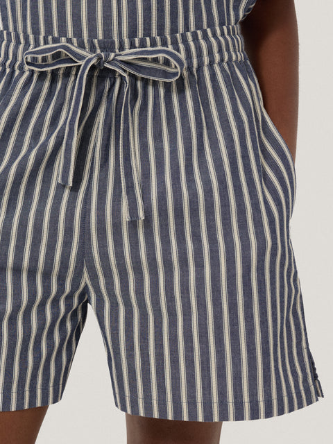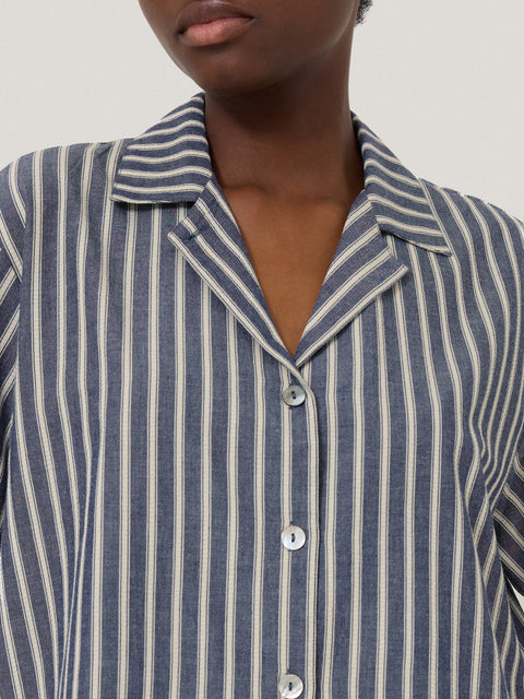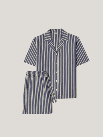 A classic pyjama style, this navy blue set features a timeless ecru ticking stripe pattern throughout on a super-soft woven cotton. Featuring a collared short sleeve shirt and shorts, this is the perfect pair for lazy mornings and weekend lounging.