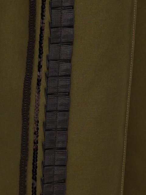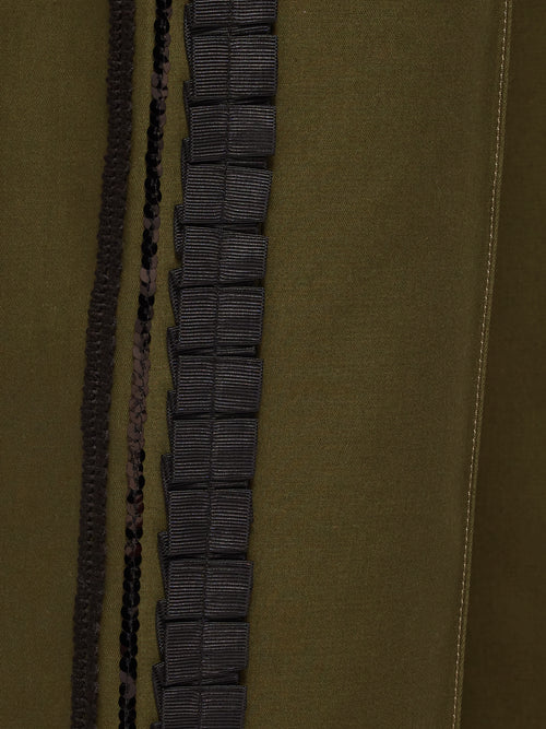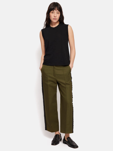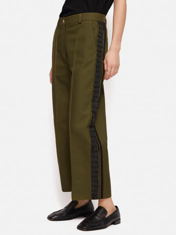 Take your transeasonal dressing to new heights with this standout trouser. Our best selling Dale block, cropped in length, has been crafted from European cotton and boasts a combination of pleated, braided and sequin-embellished trims along the side seams. Pressed pleats down the front of the trouser leg, slash pockets and belt loops for convenience. To complete the look, pair yours with our matching jacket