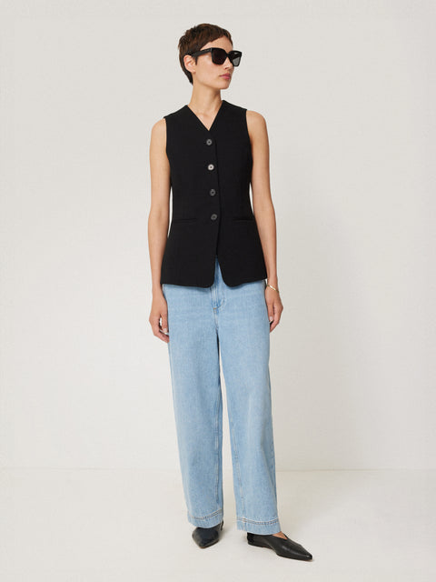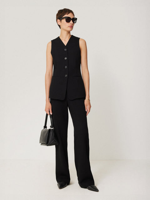 This black waistcoat transcends tailoring as a versatile design to wear casually with jeans, as well as part of a formal suited look. The contemporary longline silhouette has been cut using crepe ponte, a soft mid-weight fabric with subtle stretch, lending comfort and ease throughout the day.