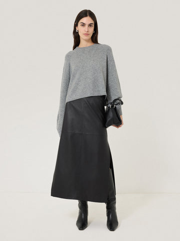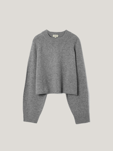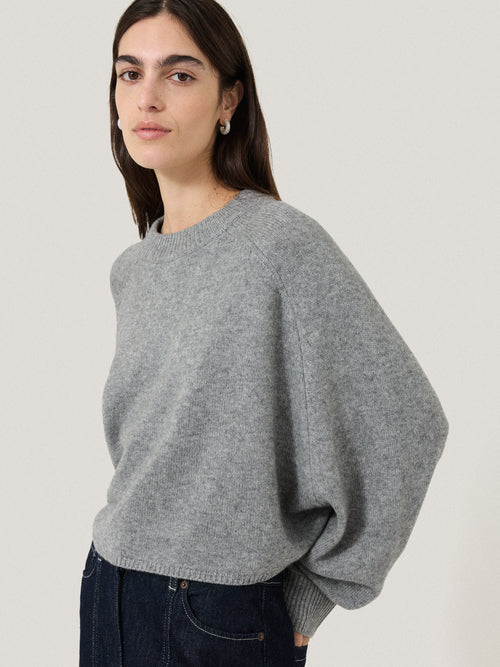 A unique fusion of a poncho and a jumper in luxurious merino wool, this crew neck style features a distinctive design where half the sleeve remains fixed. The boxy, cropped silhouette allows for dynamic layering. We love it with the sleeves rolled up against a tailored pair of trousers.