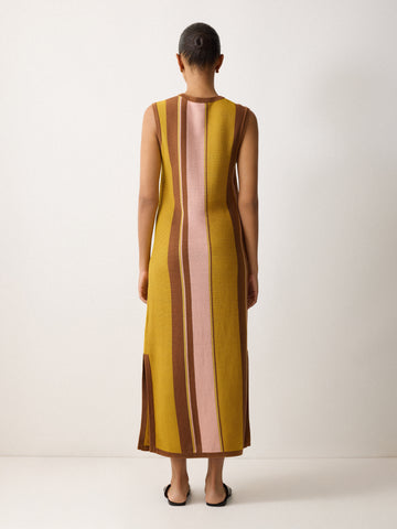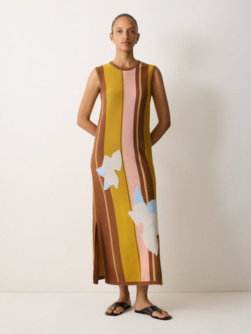 A standout piece from the SOLAR 25 collection, our Cut-Out Floral Intarsia Dress will take you from days on the beach to exploring new destinations, in a sunbaked palette of yellow and earthy brown stripes.