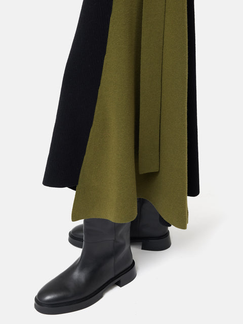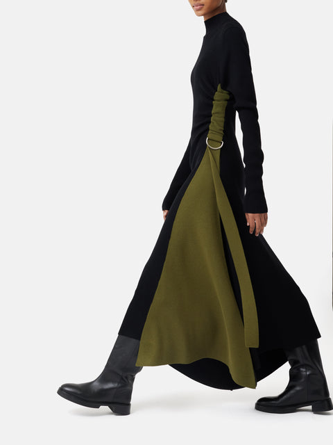 The D ring detail and contrast khaki insert add a contemporary edge to this fit and flare dress. Crafted from a stretch wool blend that gently hugs your frame in a flattering silhouette. Ground this AM to PM dress with a pair of black leather knee high boots. Fit and Features