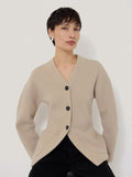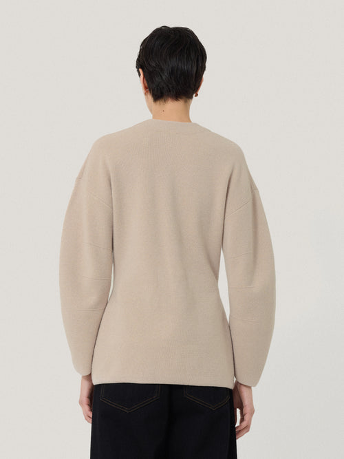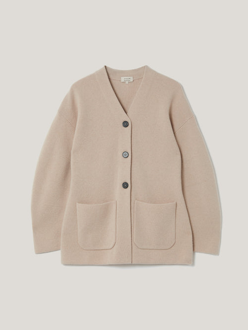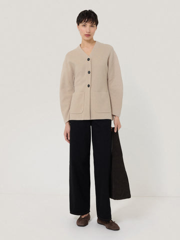 Soft in colour and fabric, this oatmeal jacket is a one-of-a-kind piece. Designed in a weightier knit of wool and cashmere gives it structure and warmth, while the darted design gives shape with an elegant fit and flare silhouette. Classic cardigan details means it can easily be worn both inside and out, with oversized front slip pockets and a button down front.