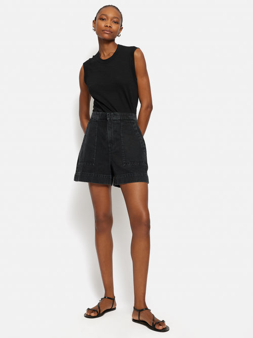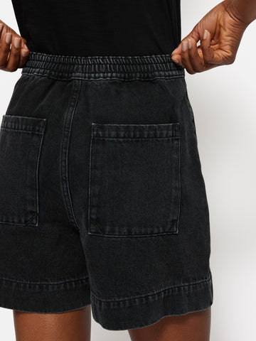 Easy-fitting denim shorts cut from a soft vintage mid blue cotton with an elasticated waistband. Front and back patch pockets lend these shorts to a utility style. Wide hems elevated by heavy topstitching. Style with a crisp white shirt for the perfect summer look. Fit and Features