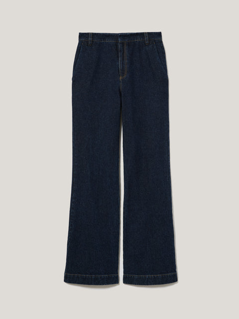 Inspired by tailoring, these denim trousers boast a timeless bootcut silhouette, with a flare that kicks out softly from the knee down to the ankle. Functionality comes from front and back pockets, while the blue wash denim features clean yellow stitching that echoes the brand’s Japanese heritage. Aksharra is 5'9.5 and wears a size 8