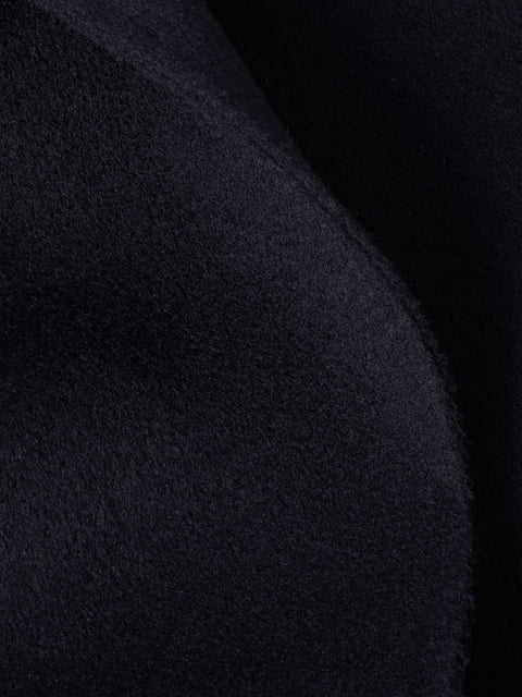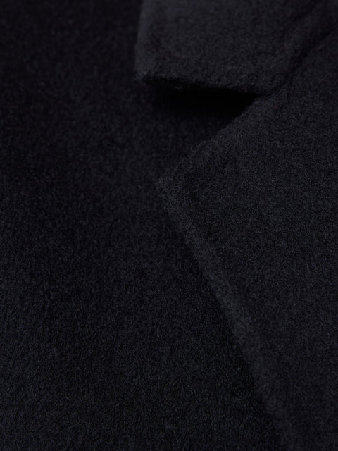 Luxury double faced coat with a single horn button front fastening. Our double-faced style is constructed by sewing two pieces of the same cloth together with invisible internal threads, making it look like one piece. It is a highly technical, time consuming and intricate process. Created in house, we have cut our pattern into an easy-fitting style with a notch lapel collar, side pockets and roomy sleeves to allow this seasons knits to fit underneath. This style is unlined as is made using an authentic double face construction.