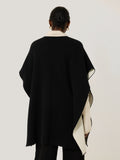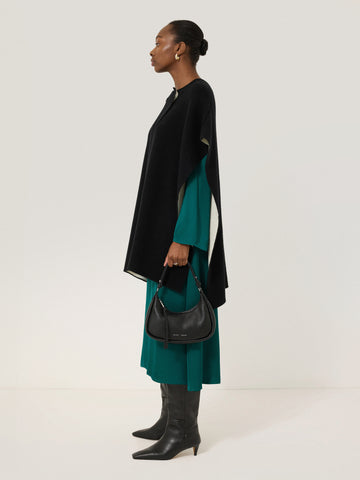 Our double-faced wool is designed with a cool hand feel to avoid overheating when it comes to layering. This process is achieved by secret stitching both pieces together as opposed to a blind seam, for quality and longevity; as seen with this cape. The two-tone design is finished with a double-breasted front to fasten over all your cold weather ensembles.